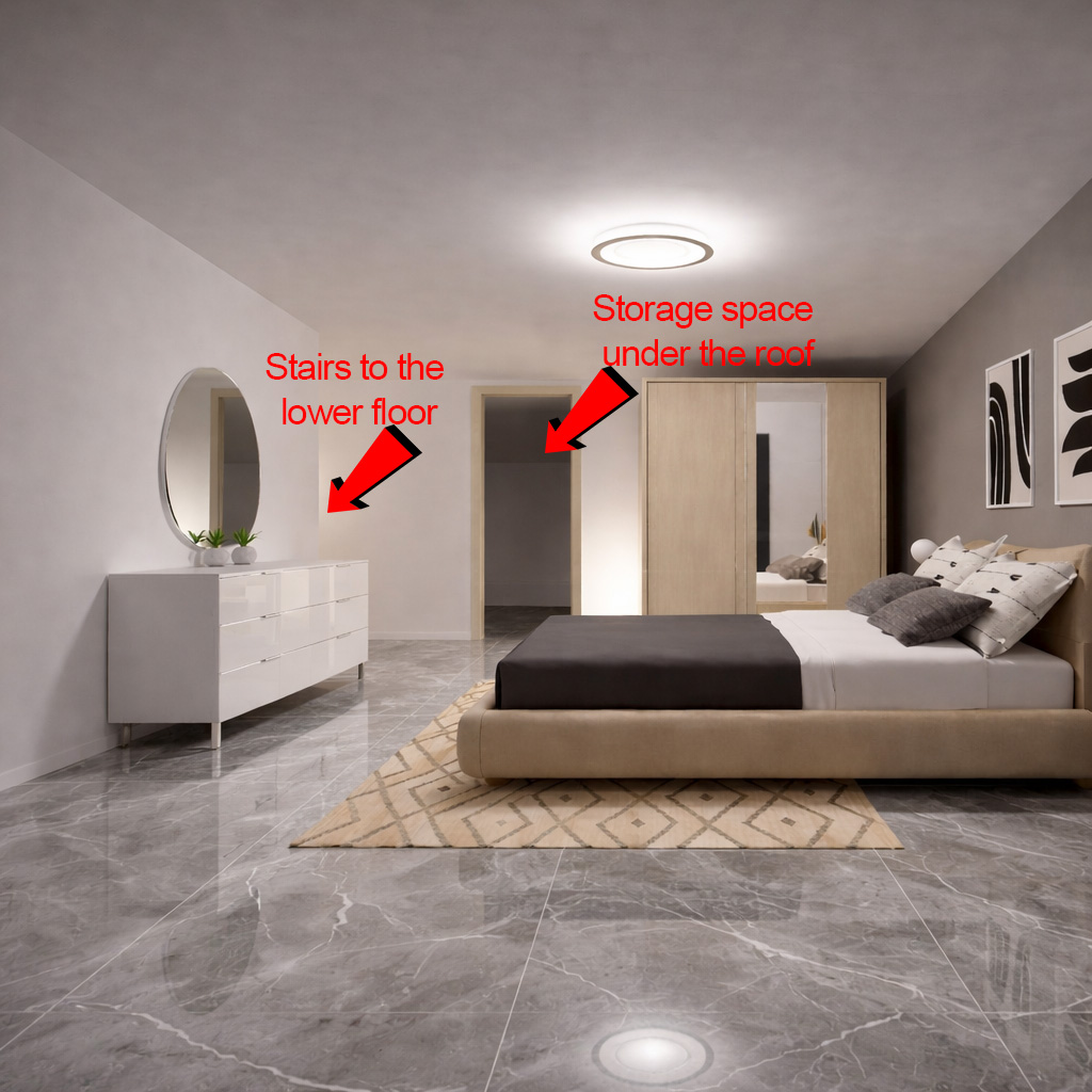 Όροφος: Ένα ευρύχωρο master υπνοδωμάτιο και μπάνιο (27 τ.μ.), καθώς και επιπλέον αποθηκευτικός χώρος στη σοφίτα 10 τ.μ.